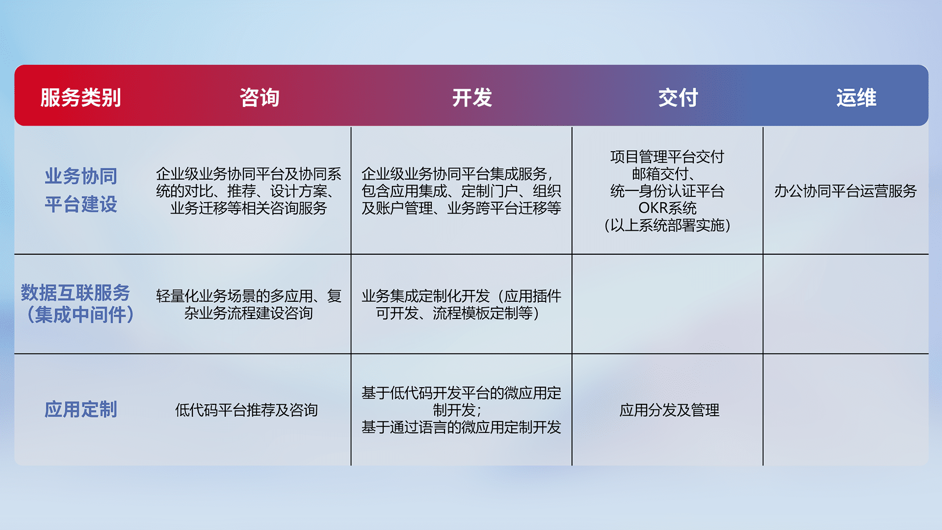 针对钉钉、、、、企微、、、、IDaas等平台级产品提供产品的规划、、方案、、、交付、、、定制化开发等服务,,,,实现如统一协同办公、、、、智能客户服务、、、、混合会议管理、、、智能数据查询、、、、等业务场景,,实现数字化转型。。